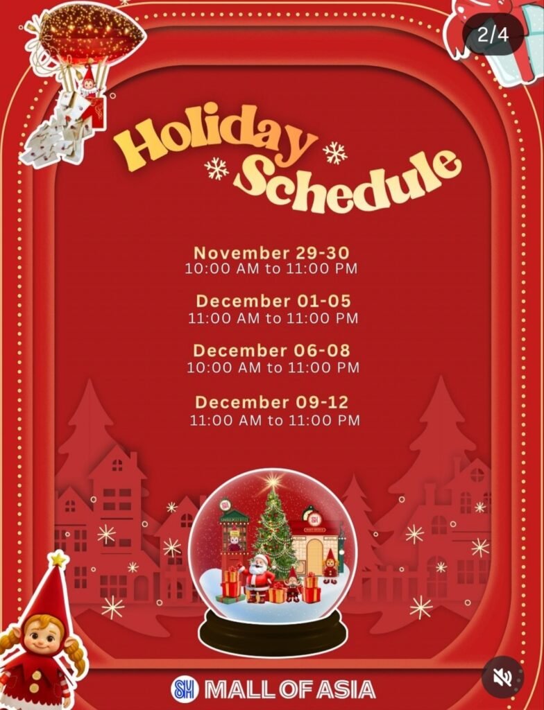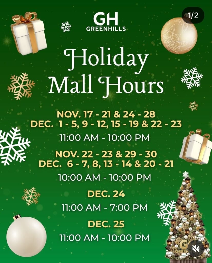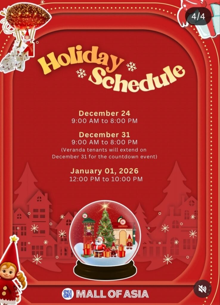 The holiday season in the Philippines is one of the busiest times of the year, with Christmas gatherings, last-minute shopping, family dinners, and festive activities happening all at once. Knowing the adjusted mall schedules can save you from stress and heavy traffic. Major malls usually release special holiday hours for Christmas Eve, Christmas Day, New Year’s Eve, and New Year’s Day—often through their official Instagram posts.